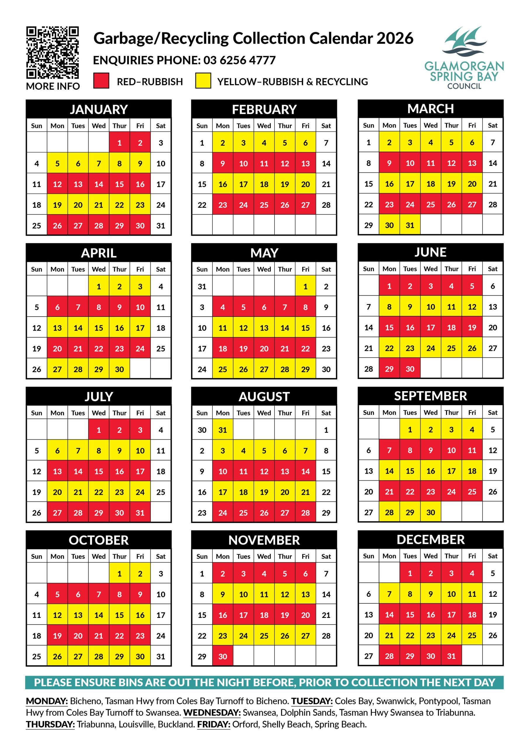 Kerbside collection days are available on the 2026 Garbage/Recycling Collection Calendar here.